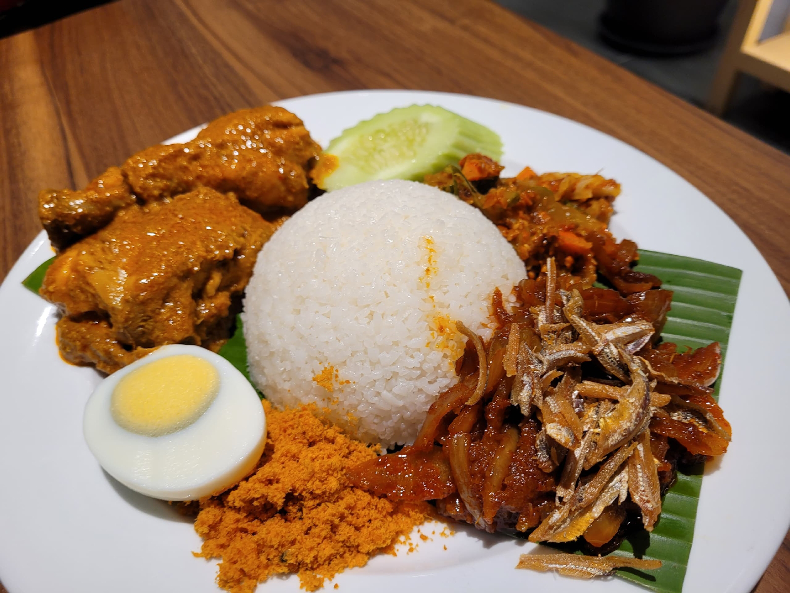 Daus makan nasi lemak kari .Nasi lemak dia terkenal, disajikan dengan sambal yang pedas, telur rebus, kacang tanah, dan ikan bilis.